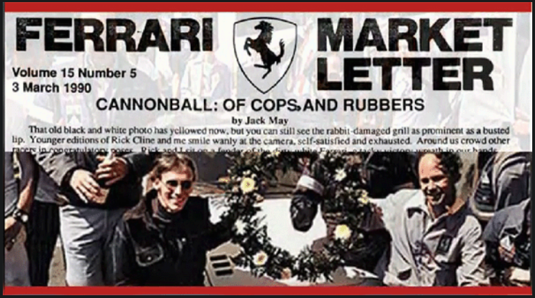 Revised from Jack May, “Cannonball: Of Cops and Rubbers,” Ferrari Market Letter, Vol. 15, No. 5, March 3, 1990. © 1990. Ferrari Market Letter.
